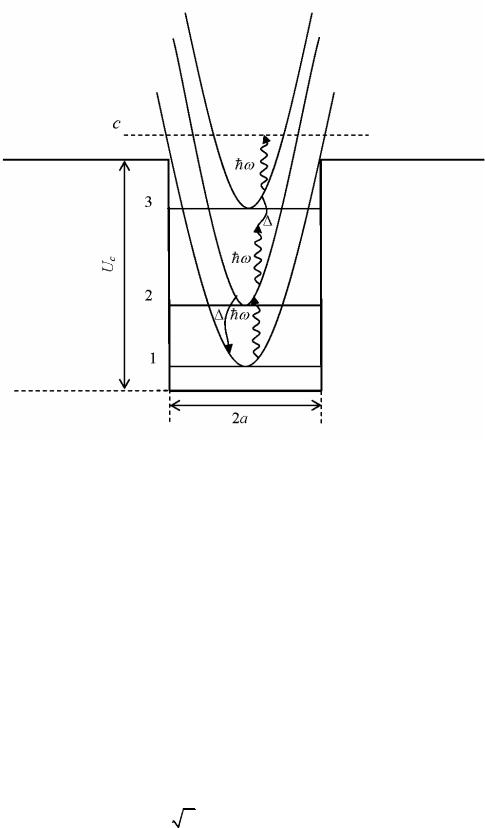 Рассмотрим глубокую прямоугольную квантовую яму для электронов с шириной 2a и глубиной Uc (рис. 4.1). Считаем, что глубина ямы Uc достаточно велика (порядка 1.5-2 эВ). Пусть в яме существует не менее трех подзон размерного квантования, которые мы пронумеруем как 1, 2 и 3. При этом в отсутствие оптической накачки электроны с концентрацией n0 заполняют состояния вблизи дна нижней подзоны 1 до квазиуровня Ферми EF, тогда как подзоны 2 и 3 практически не заселены. Предполагается, что энергетические зазоры между подзонами ћωij велики по сравнению с температурой T и EF. Считаем также, что ω32 > ω21 и ω32 > ω, причем частота падающего света попадает в резонанс с переходом между первой и второй