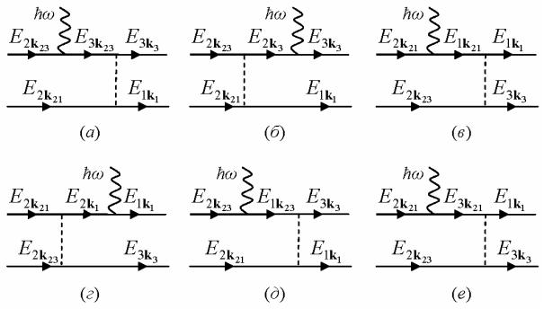 Вычислим вероятность перехода между состоянием, в котором имеется два электрона в подзоне 2 с волновыми векторами k21 и k23 и состояниями, в которых один электрон оказывается в подзоне 3 с волновым вектором k3, благодаря поглощению фотона ћω, и энергии выделяющейся на переходе второго электрона из подзоны 2 в подзону 1 с волновым вектором k1. Все указанные волновые векторы двумерны. Вычисления проводим во втором порядке теории возмущений – один порядок по межэлектронному кулоновскому взаимодействию и один – по взаимодействию электронной системы со светом. Представим выражение для вероятности перехода в виде: