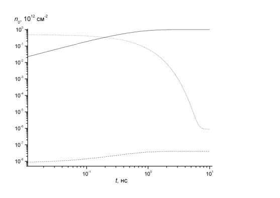 Рис. 4.4. Зависимости концентраций носителей в подзонах размерного квантования и в зоне проводимости от времени с момента включения импульса накачки; n1, n2 – пунктирная линия; n3 – штриховая линия; nc – сплошная линия