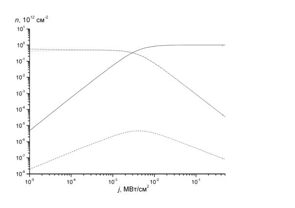 интенсивностях света заселенности первой и второй подзон размерного квантования практически выравниваются. Заселенность третьей подзоны все время остается низкой в силу того, что из этой подзоны электроны, по-