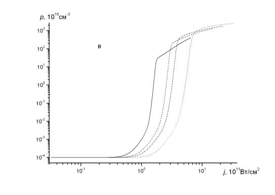 Рис. 5.7. Зависимости концентраций электронов в зонах c (а), c1 (б) и дырок в зоне (в), возникших в результате действия импульсов с продолжительностями 1 пс (сплошная линия), 5 пс (штриховая линия), 10 пс (штрих-пунктирная линия) и 50 пс (пунктирная линия), от интенсивности света j