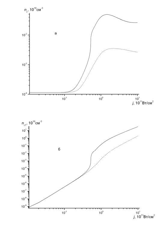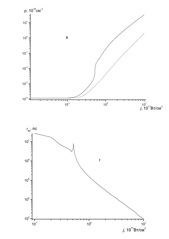 Рис. 5.8. Сплошные линии – зависимости квазиравновесных концентраций электронов в зонах c (a), c1 (б), дырок в зоне v (в) и времени установления квазиравновесных концентраций (г) от интенсивности света для случая l = 3; штриховые линии (а, б, в) – те же зависимости, рассчитанные без учета процесса c1 + 2hω → ccv ; в расчетах использовались следующие значения параметров: