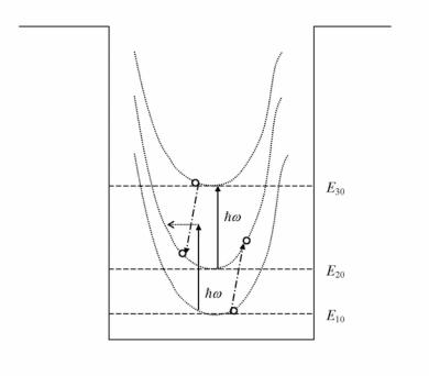 второй и третьей подзонами: ω ≈ ω32. При малых интенсивностях света j идут лишь очень слабые фотопереходы в области далекого коротковолнового крыла полосы поглощения между подзонами 1 и 2. Эти переходы являются непрямыми в двумерном k-пространстве. Они происходят в состояния, далекие от дна подзоны 2 с передачей большого поперечного импульса, например, за счет участвующих в элементарном акте фононов. При увеличении интенсивности j те немногие электроны, которые оказались в подзоне 2, быстро (за времена ~ 10−13 c) попадают на дно этой подзоны, по-