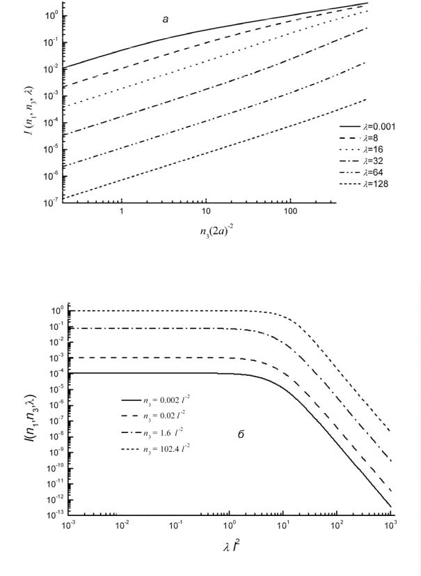 Рис. 2.2. Интеграл I (d ) (n%1, n%3 ,λ%) в формулах (2.15, 2.16) как функция от n%3 при различных значениях λ%(а) и как функция λ% при различных значениях n%3 (б); n%1 = 0.5