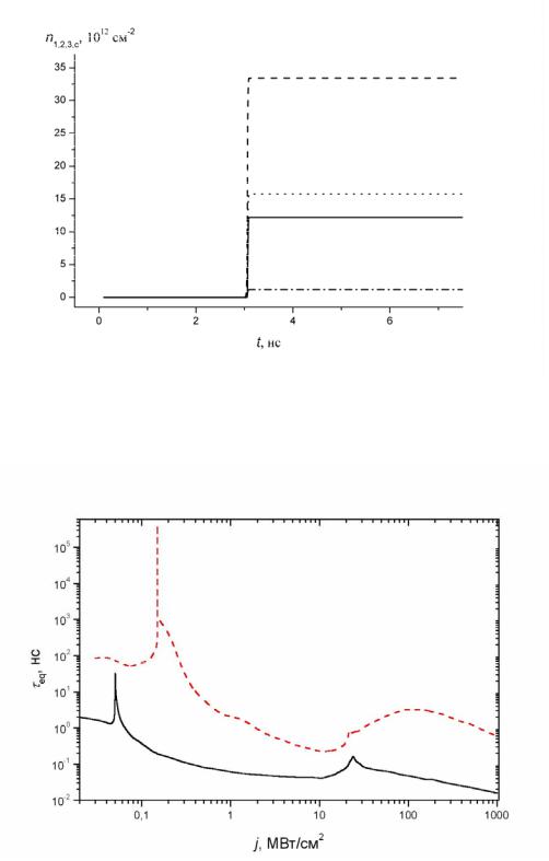 jth 149.3 кВт/см2. В широкой области jth < j < jth(1) ( jth(1) ≈ 21.5 МВт/см2) происходит плавное изменение заселенностей: n1 и n2 достигают максимума и начинают уменьшаться, а n3 и nc монотонно возрастают. При значени-