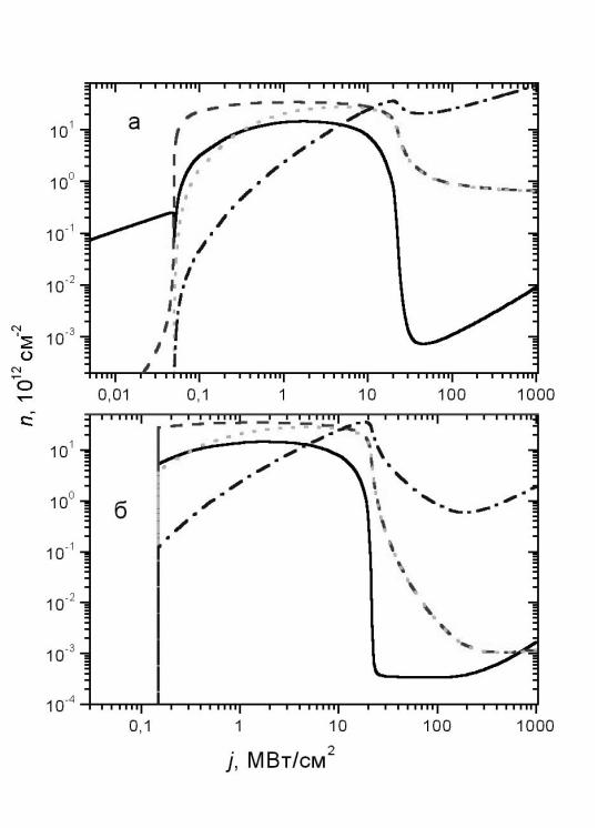 ях j вблизи jth(1) происходит выравнивание заселенностей подзон 2 и 3. При этом запирается главный канал поглощения света – резонансные межподзонные переходы 2→3. Кроме того, из-за высокой концентрации электронов в подзоне 2 оказываются занятыми состояния в этой подзоне, являющиеся конечными для главного «лавинообразующего» процесса оже-типа 31 → 22. Наконец, увеличивается скорость бимолекулярной рекомбинации электронов и дырок. В совокупности это приводит к резкому уменьшению поглощаемой световой энергии и быстрому падению заселенностей при увеличении j в области j ≈ jth(1) , хотя их изменение оказывается менее рез-