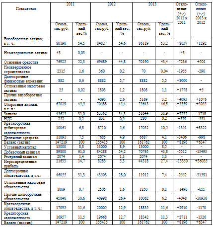 По данным таблицы 2 видно, что общая стоимость имущества предприятия на конец 2012 г. увеличилась на 8196 тыс. руб. и составила 155415 тыс. руб., в 2013 г. стоимость имущества увеличилась на 6347 тыс. руб. и составила 161762 тыс. руб.