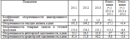Коэффициент оборачиваемости авансированного капитала показывает, что в организации на 1 рубль вложенных в производство средств приходится на 2011 год - 0,9 рубля реализованной продукции работ, а в 2012 году произошло увеличение на 0,1 пункта и составило 1 рубль, в 2013 году изменений не произошло.