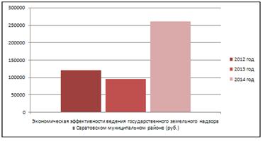 Экономическая эффективность (увеличение местного бюджета) ведения государственного земельного надзора в Саратовском муниципальном районе существенно возросла в 2014 году. Данная ситуация связна с высоким профессионализмом работы инспекторов Управления Федеральной службы государственной регистрации кадастра и картографии по Саратовской области (Управления Росреестра по Саратовской области) (рисунок 3).