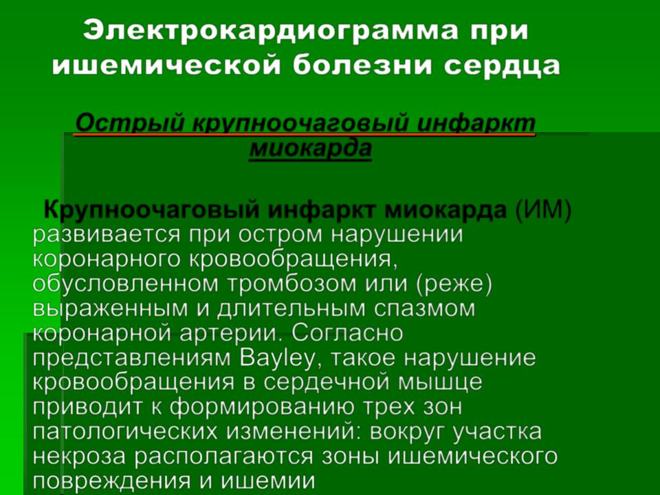 развивается при остром нарушении коронарного кровообращения, обусловленном тромбозом или (реже) выраженным и длительным спазмом коронарной артерии. Согласно представлениям Bayley, такое нарушение кровообращения в сердечной мышце приводит к формированию трех зон патологических изменений: вокруг участка некроза располагаются зоны ишемичеcкого повреждения и ишемии