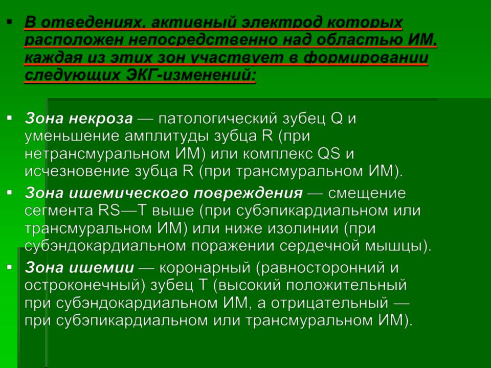 В отведениях, активный электрод которых расположен непосредственно над областью ИМ, каждая из этих зон участвует в формировании следующих ЭКГ-изменений: