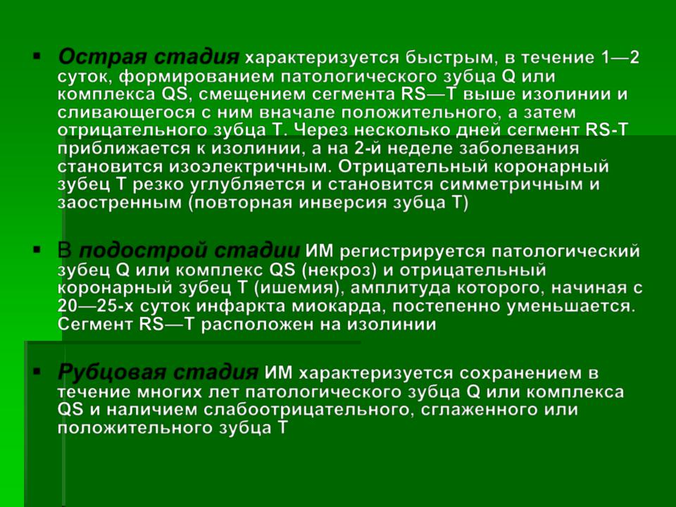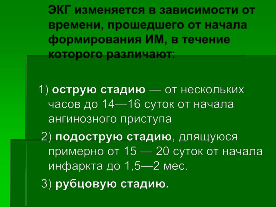 ЭКГ изменяется в зависимости от времени, прошедшего от начала формирования ИМ, в течение которого различают: