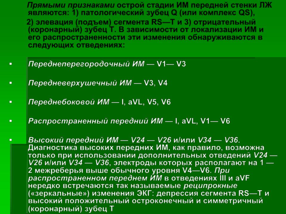 Диагностика высоких передних ИМ, как правило, возможна только при использовании дополнительных отведений V24 — V26 и/или V34 — V36, электроды которых располагают на 1 — 2 межреберья выше обычного уровня V4—V6. При распространенном переднем ИМ в отведениях III и aVF
