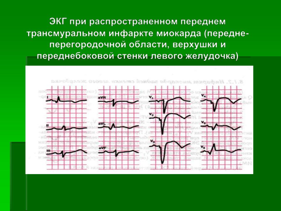 ЭКГ при распространенном переднем трансмуральном инфаркте миокарда (переднеперегородочной области, верхушки и переднебоковой стенки левого желудочка)
