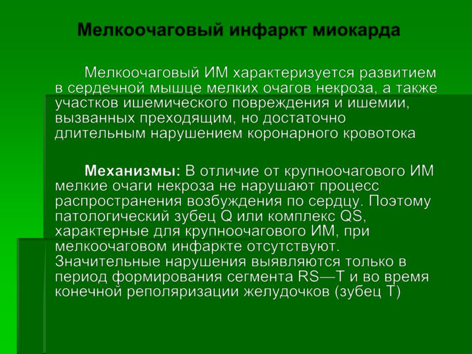 Механизмы: В отличие от крупноочагового ИМ мелкие очаги некроза не нарушают процесс распространения возбуждения по сердцу. Поэтому патологический зубец Q или комплекс QS, характерные для крупноочагового ИМ, при мелкоочаговом инфаркте отсутствуют. Значительные нарушения выявляются только в период формирования сегмента RS—Т и во время конечной реполяризации желудочков (зубец Т)