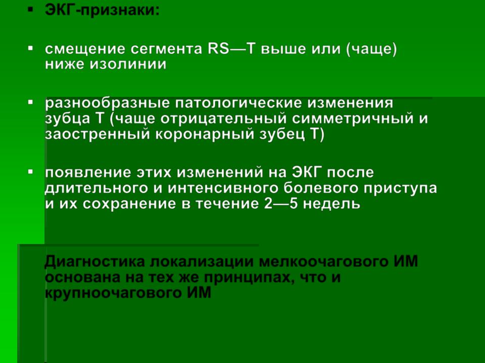 появление этих изменений на ЭКГ после длительного и интенсивного болевого приступа и их сохранение в течение 2—5 недель