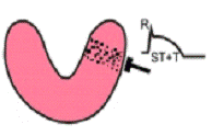 Это конечная стадия развития инфаркта миокарда, которая длится на протяжении многих лет, обычно в течение всей жизни больного. На месте некроза происходит рубцевание ткани, которая стягивает соседние здоровые участки миокарда. Рубцовая ткань электрофизиологически ведет себя так же, как и некроз - она не возбуждается и не создает ЭДС (ЭКГ регистрирует патологический зубец Q: QR (qR) - при нетрасмуральном рубце; QS (Qr, QR) - при трансмуральном). Одновременно с образованием рубца происходит компенсаторная гипертрофия оставшихся мышечных волокон, что приводит к уменьшению зоны инфаркта (Трансмуральные ИМ может превращаться в нетрансмуральный). Зоны повреждения и ишемии отсутствуют, т.к. обмен веществ в тканях восстанавливается. Это можно увидеть на рисунку слева.