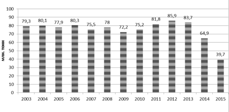 2015 р. видобуток знизився до 39,7 млн. тонн, що майже вдвічі менше ніж у 2014