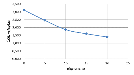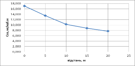 значення про бігового викиду шкідливих речовин СО, Сm Нn, NOx, середнє значення інтенсивності викидів, обчислимо концентрацію