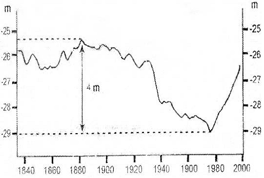 В XX столетии уровень Каспийского моря существенно изменялся дважды. В 1929 г. он стоял на отметке около минус 26 м, и, поскольку он был близок к этой отметке в течение почти столетия, это положение уровня рассматривалось как средне многолетнее или вековое. В 1930 г. уровень стал стремительно снижаться. Уже к 1941 г. он понизился почти на 2 м. Это привело к обсыханию обширных прибрежных площадей дна. Понижение уровня, при небольших его колебаниях кратковременных незначительных подъемах уровня в 1946-1948 и 1956-1958 гг., продолжалось до 1977 г. и достигло отметки минус 29,02, т.е. уровень занял самое низкое положение за последние 200 лет. В 1978 г. началось, вопреки всем прогнозам, повышение уровня моря. По состоянию на 1994 г. уровень Каспийского моря находился на отметке минус 26,5 м, т.е. за 16 лет уровень поднялся более, чем на 2 м. Скорость этого поднятия 15 см/год. Приращение уровня в отдельные годы было выше ив 1991 г. достигало 39 см. Быстрые изменения уровня оказывают большое влияние на динамику береговой зоны Каспия и накладывают отпечаток на всю народнохозяйственную деятельность прикаспийских государств. На Каспийском море как бы моделируются процессы влияния быстрого подъема уровня бассейна на природную обстановку окружающей суши. Изучение этих процессов очень валено в связи с тем, что прогнозируется быстрое повышение в ближайшие десятилетия уровня Мирового океана, что связано с общим потеплением климата Земли и проявлениями усиления «парникового эффекта» [16].