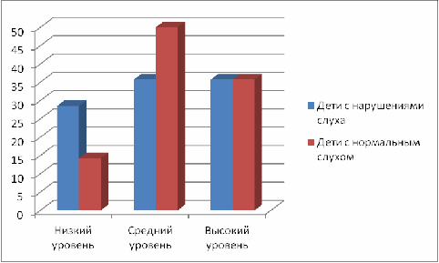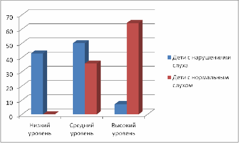 Таким образом, представления о животных у большинства детей с нарушениями слуха в основном находятся на низком и среднем уровне. Дети с нормальным слухом находятся на среднем и высоком уровне развития представлений о животных.