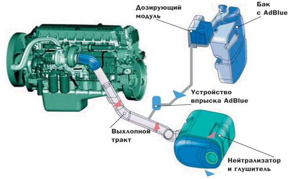модулем и устройством впрыска жидкости AdBlue. Работает эта