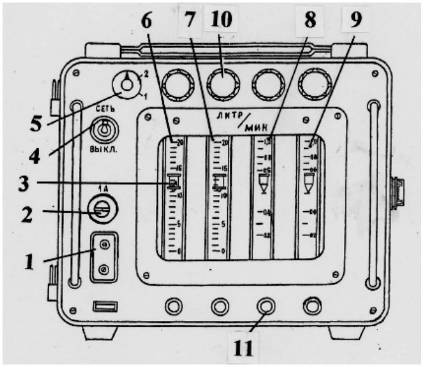 колодка; 2 - предохранитель; 3 - поплавок ротаметра; 4 - тумблер включения и