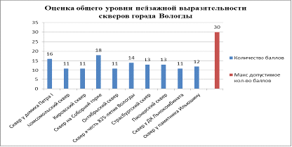 В качестве сравнительной оценки были разработаны графики уровня оценки скверов города Вологды, как общий, так и по каждому показателю признаков пейзажной выразительности.