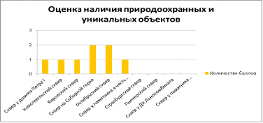 Шестой график (Рис. 4.6) показывает наличие и разнообразие природоохранных и уникальных объектов. Многообразие получили только сквер на Соборной горке и Октябрьский сквер, остальные же имеют однообразное разнообразие природоохранных объектов, либо вовсе не имеют ничего.