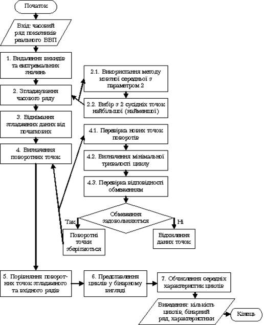 Алгоритм ґрунтується на підходах, подібних до методики Національного бюро економічних досліджень. Однак, на відміну від цієї методики, алго-ритм передбачає використання лише одного часового ряду для визначення фаз циклів - реального ВВП. Поетапну роботу алгоритму датування циклів на основі процедури Брай-Бошена наведено на рис. 1.2. Потрібно зазначити, що алгоритм передбачає виконання зазначених вище 5 правил (обмежень) щодо квартальних даних ВВП. Однак вони можуть відповідним чином трансформуватись при дослідженні циклічності річних(місячних) показників.