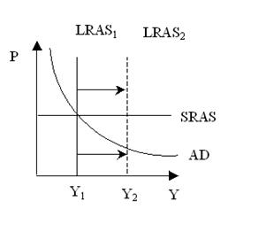 ) зміщенням праворуч лінії довгострокової сукупної пропозиції LRAS від LRAS1 до LRAS2;
