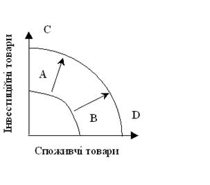 ) зміщенням праворуч кривої виробничих можливостей із положення АВ
