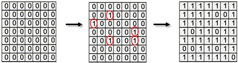 · Если клетка находится в состоянии 0, то её новое состояние берётся из ячейки слева от неё. В противном случае, её состояние берётся из ячейки справа от неё.