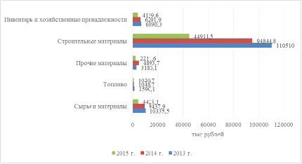 За исследуемый период материальные затраты на предприятии сократились (в 2014 г. по сравнению с 2013 на 12,1%, а в 2015 г. по сравнению с 2014 г. на 51,3%). Наибольшее сокращение в 2015 г. по сравнению с 2014 г. произошло по прочим материалам (на 54,8%), сырью и материалам (на 53,1%), а также строительным материалам (52,6%). Во многом это было обусловлено использованием новых, более экономичных материалов при осуществлении строительно-монтажных работ.