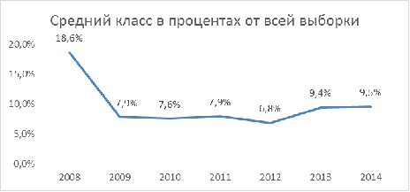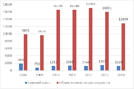 На графике 1 можно увидеть динамику оценки численности среднего класса. После 2008 года наблюдается резкое падение среднего класса, при этом абсолютное значение в выборке в 2009 году было самым низким. Затем, в 2010 году выборка была значительно расширена (до 16500 респондентов) и абсолютное количество представителей среднего класса пропорционально возросло. Однако процент представителей среднего класса оставался неизменным, в 2012 году он снизился до самого низкого наблюдаемого значения - 6, 8%. А в 2013 году вырос до нового уровня 9, 5%.