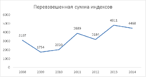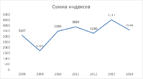 Сумма индексов показывает дополнительно изменение потенциала тех, кто не вошел в средний класс вместе с увеличением количества людей с высшим образованием, сбережениями и умственным характером труда. Как в абсолютных значениях (ГРАФИК), так и в относительных, сумма индексов повторяет снижения процента среднего класса в 2009. Однако впоследствии динамика суммы индексов с динамикой среднего класса не совпадает, в 2011 отмечается резкий рост суммы индексов, в итоге уровень 2011 года превышает уровень 2008, что совершенно не характерно для процента среднего класса, который так и не восстановился до докризисного уровня.