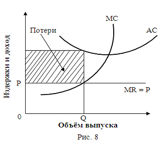 2) цена ниже минимально возможных средних издержек, т. е. фирма не покрывает все свои издержки и несут убытки (рис. 8);