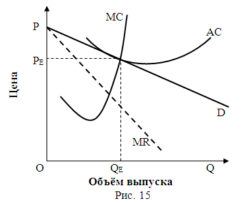 В долгом периоде максимизация прибыли предполагает такой объём выпуска, при котором предельный доход равен долгосрочным предельным издержкам. В долгом периоде сверхприбыли стимулируют новые фирмы ко входу на рынок, что вызывает понижение кривой спроса для закрепившихся фирм, т. е. сдвигает кривую спроса влево. Это означает уменьшение объёма продаж при каждом уровне цен. Вход новых фирм будет продолжаться до тех пор, пока дополнительные прибыли не исчезнут (рис. 15).