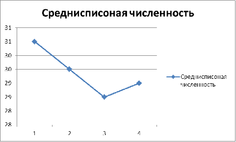 Из таблицы видно, что на начало года численность составляла 31 человек, в 1 квартале принято 3 человека, уволено 4 человека на конец 1 квартала численность составила 30 человек, во втором квартале принято 8 человек, уволено 9 человек, в третьем квартале принято 2 человека уволено 3 человека, в четвертом квартале принято 6 человек, уволено 4 человека, на конец года среднесписочная численность составила 29 человек.