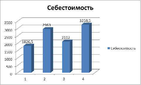 Из таблицы видно, что себестоимость продукции в первом квартале составила 1826,5 тыс. руб. во втором - 2963 тыс. руб. в третьем квартале 212 тыс. руб. , в четвертом - 3258,5. наблюдается увеличение на 1432 тыс. руб. это связано прежде всего с объемом производства. Графически себестоимость продукции представлена на рисунке 7.