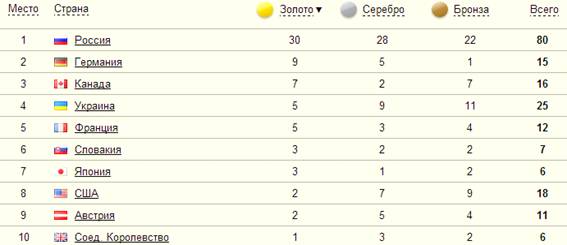 Таблица 2. Турнирная таблица Параолимпийских зимних игр - 2014
