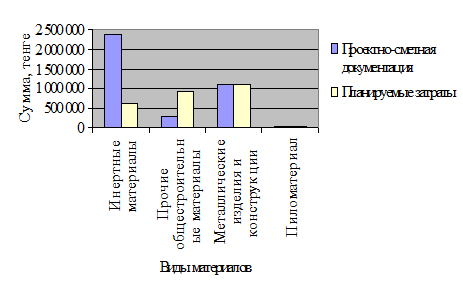 Из рисунка 19 видно, что значительная разница при сравнении проектных и планируемых затрат получается в основном по инертным материалам и прочим общестроительным материалам. Снижение первого вида материальных ресурсов (на 1 734 204 тенге) и увеличение второго (595 448 тенге) обусловлено тем, что в проектной документации заложены готовые строительные растворы и бетоны, а фактически вышеуказанные смеси будут изготавливаться по отработанной технологии непосредственно на строительной площадке (для сокращения сроков простоя из-за доставки готовых бетонных смесей автобетоносмесителями и уменьшения расхода материалов). А увеличение прочих строительных материалов при фактическом выполнении работ учитывает дополнительное количество материалов, которые не учтены проектом и могут потребоваться в процессе производства.
