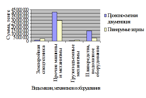 Из рисунка 20 можно сделать вывод, что увеличение суммы по землеройной спецтехнике (на 1 819 721 тенге) и грузоподъемным механизмам (на 85 834 тенге) происходит вследствие того, что эти виды машин - наемная спецтехника. В сметном расчете проекта закладывается только стоимость эксплуатации машин, арендная плата за которые при найме на порядок выше той, что указана в проекте. Значительное уменьшение суммы по прочим машинам (на 12 163 446 тенге), плавсредствам и водолазному оборудованию (на 9858 061 тенге) появляется из-за того, что все эти механизмы - собственность предприятия. И при расчете планируемых затрат в расчет закладывается стоимость амортизации собственных машин, механизмов и оборудования, если они полностью еще не самортизировали.