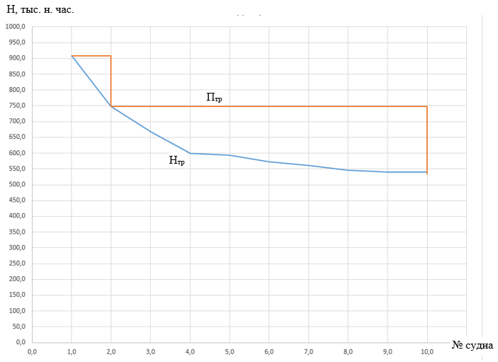Графики зависимости нормы трудоемкости и плановой трудоемкости от порядкового номера судна показаны на рис. 1.1.