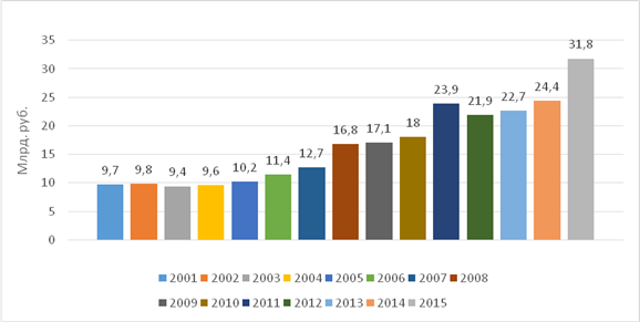 Диаграмма 1 - Производство продукции сельского хозяйства в Тверской области в фактических ценах в 2001-2015 гг., млрд. руб.
