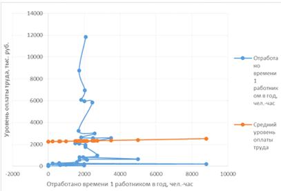 3) провести корреляционно-регрессионный анализ связи между уровнем оплаты труда и временем затраченным на работу;