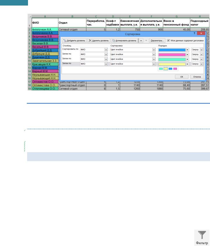 Фильтр по цвету – выбор по форматированию ячейки: по цвету ячейки, по цвету шрифта и по значку ячейки (если установлено условное форматирование);