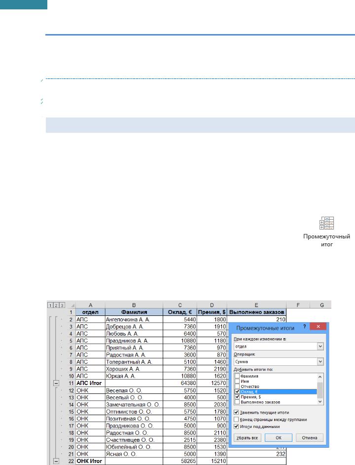 Команда Промежуточный итог [Subtotal] вставляет в таблицу новые строки, содержащие специальную функцию ПРОМЕЖУТОЧНЫЕ.ИТОГИ(Номер_функции; Ссылка)