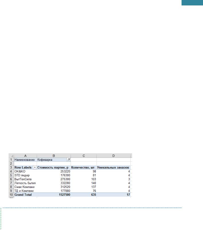 Добавить в Значения еще раз поле Количество, шт. Подсчитать сколько уникальных поставок Кофеварок у каждого Поставщика по количеству в партии.