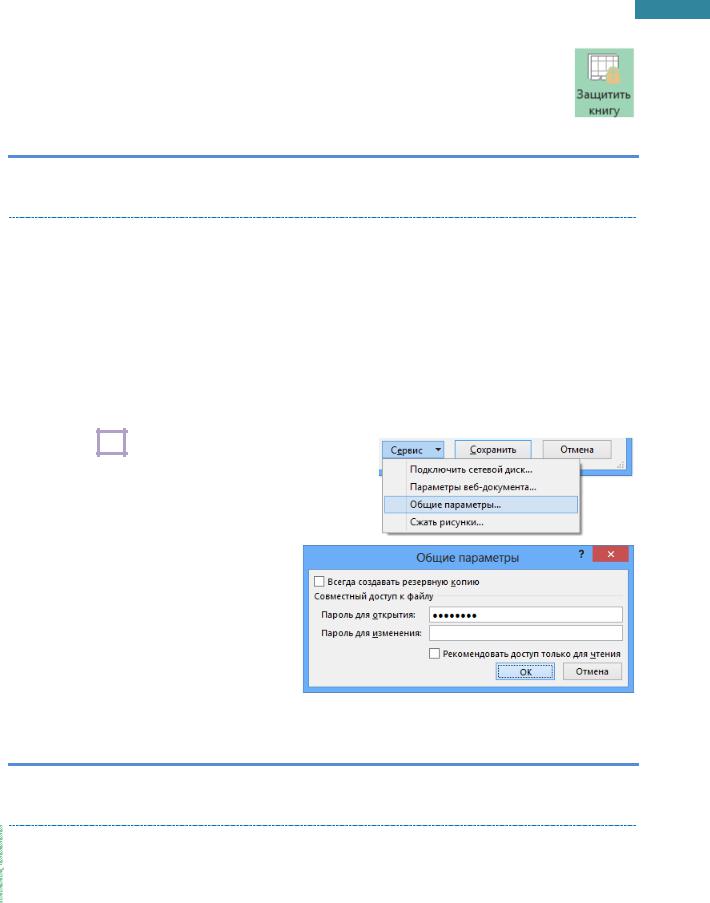 Книгу Excel можно защитить как от открытия, так и от изменений. Если задан пароль для открытия файла, то рабочая книга может быть открыта только в случае, если пароль известен. Если установить защиту от изменений в рабочей книги, то изменения в книге могут быть сохранены только после указания пароля или путем пересохранения рабочей книги под другим именем.